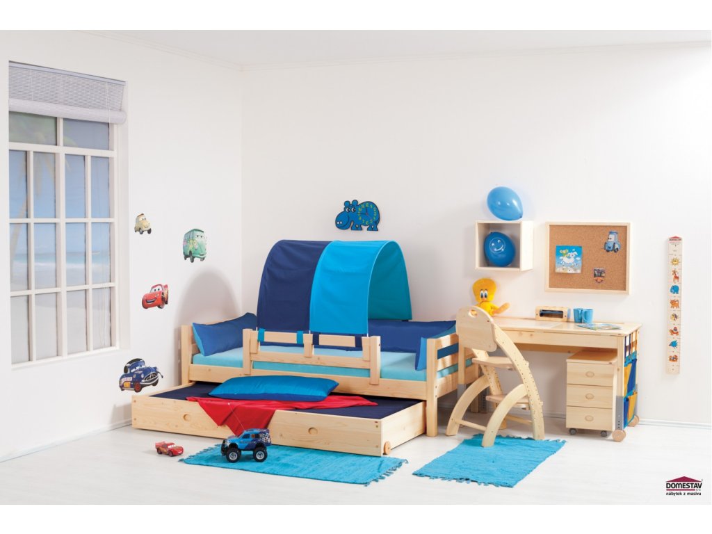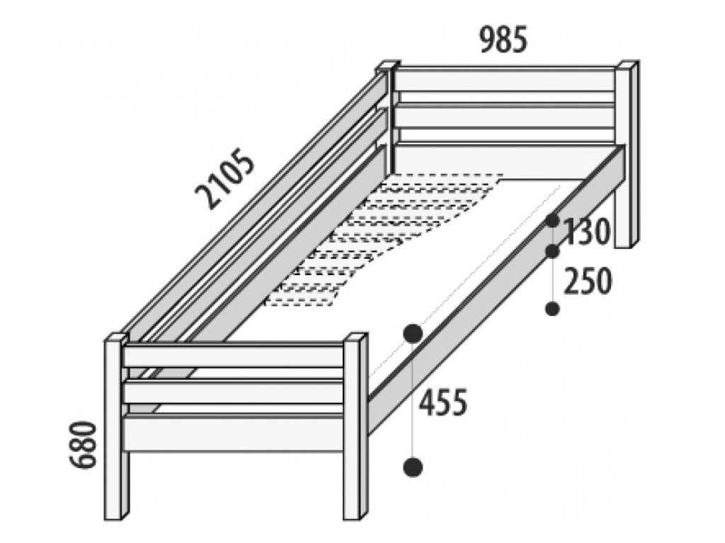Čela postelí jsou slepena pevným kolíkovým spojem. Pevné spojení bočnic a zábran zajišťuje nábytkový šroub s plochou hlavou a metrickým válečkem. Stabilní konstrukce zaručuje bezpečnost a pohodlí pro Vaše dítě. Hrany dětské postele jsou ze všech stran zaobleny pro bezpečné používání i těmi nejmenšími. Výhodou této masivní postele je vysoká nosnost až 130kg, proto si hravě poradí s vašim dítětem, tak i jeho kamarády až do studentských let. Při použití matrace o výšce 150 mm je výška ložné plochy 430 mm.
