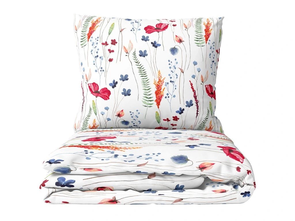 Na světlém podkladu se rozprostírají červené máky, modré chrpy, žluté klasy obilí a zelené kapradiny s drobnými travinami, doplněné o jemné béžové větvičky a hnědé stonky. Vzor je přehledný, vzdušný a vyvážený, působí jako rozkvetlá letní louka plná barev a života. Kombinace červené, modré, žluté a zelené vytváří optimistický a svěží dojem, který zútulní každou ložnici.