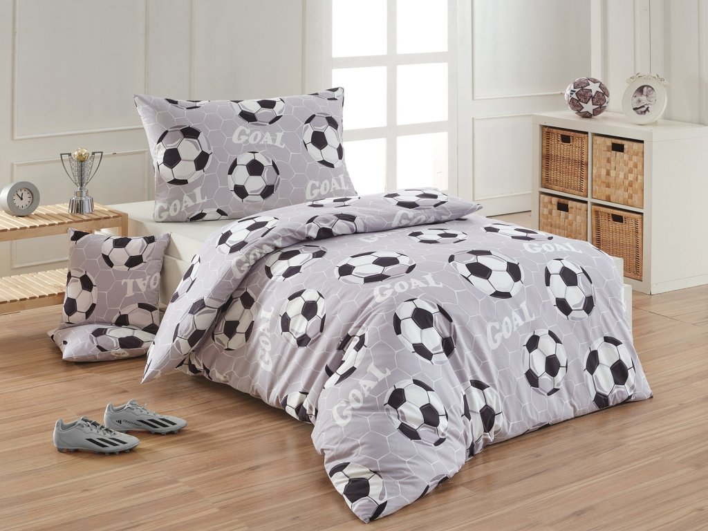 Bavlněné povlečení Goal - šedé pro všechny velké i malé sportovce. Šedé povlečení s motivem fotbalových míčů a nápisu GOAL. Povlak na polštář i na přikrývku je z obou stran stejný. Povlečení je vyrobeno ze 100% bavlny v úpravě deluxe a je opatřeno praktickým zipovým uzávěrem.